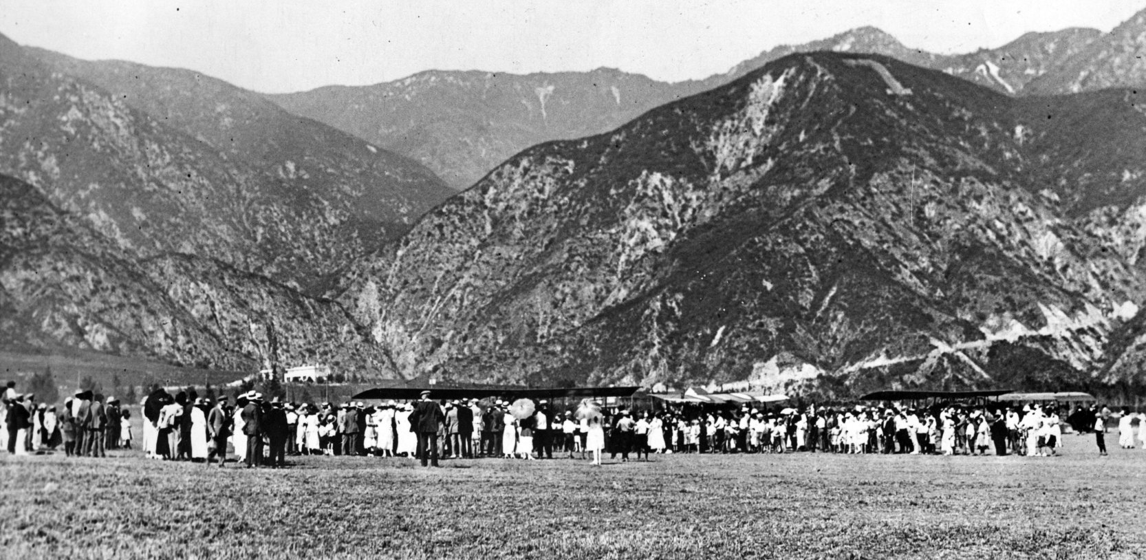 A circa 1919-21 photo of a crowd & several planes at Altadena Airport (courtesy of the Altadena Historical Society, via Dan MacPherson).