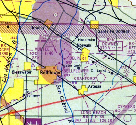 The earliest aeronautical chart depiction which has been located of Bellflower Airport was on the 1947 LA Local Aeronautical Chart (courtesy of Tim Zukas).