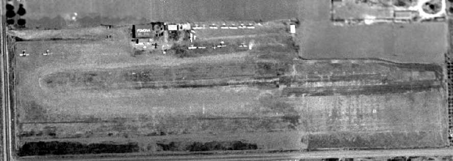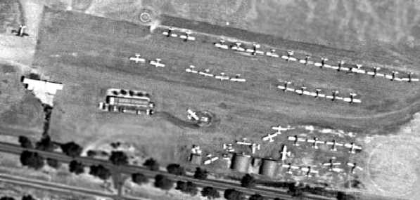 It depicted a single northeast/southwest unpaved runway, and several dozen light aircraft parked on both sides.