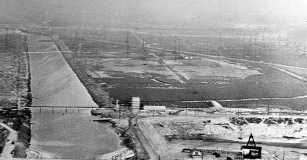 In a 1937 aerial view looking east (courtesy of Kevin Walsh), the trace of the Playa del Rey Motordrome was still recognizable as a light-colored circular feature to the right of the channel,