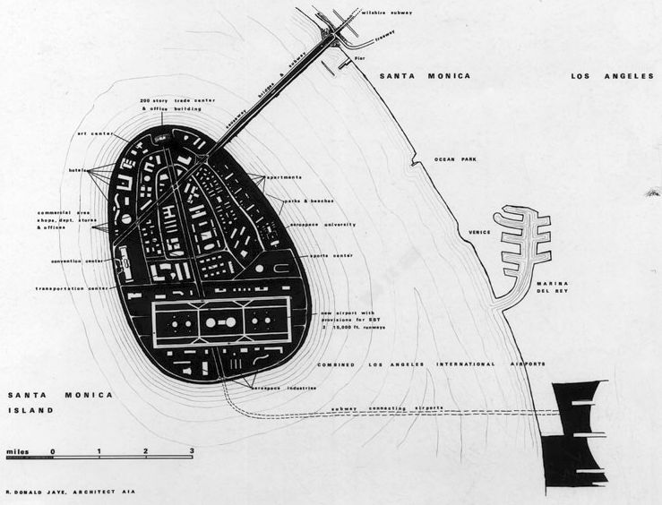 Drawing shows a new Santa Monica Island with a subway connecting to the airports (bottom) & a causeway, bridges & subway at the top of drawing.