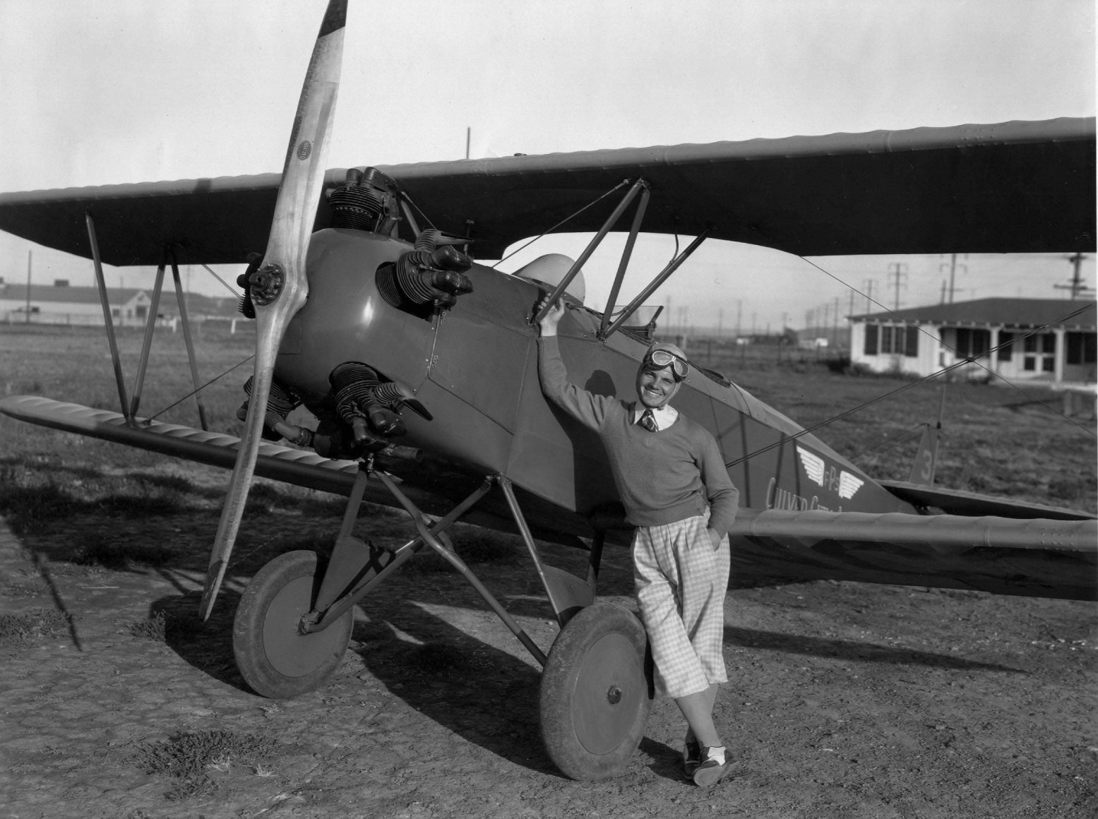 A circa 1920s-30s photo of movie actor Eddie Quillan with a Fleet biplane at Culver City Airport.