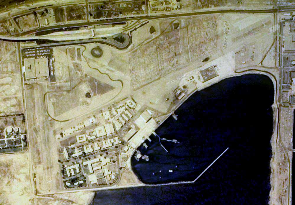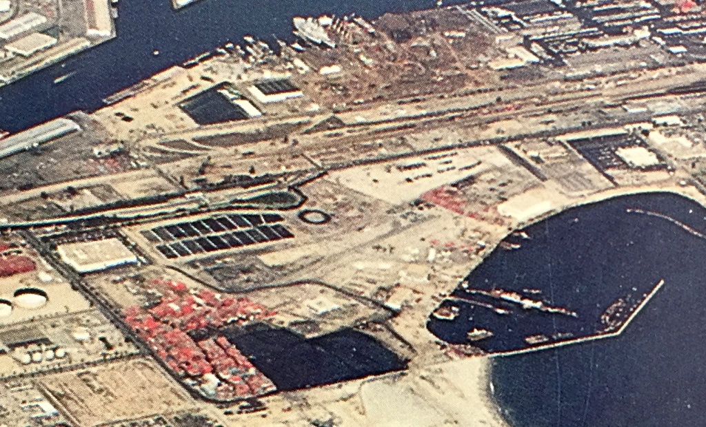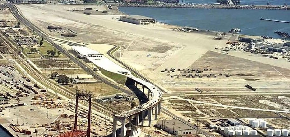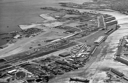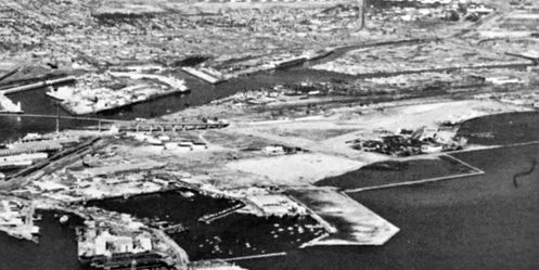 A 1980 aerial view showed that 3 large hangars still remained standing on the south side of the former Terminal Island airfield.
