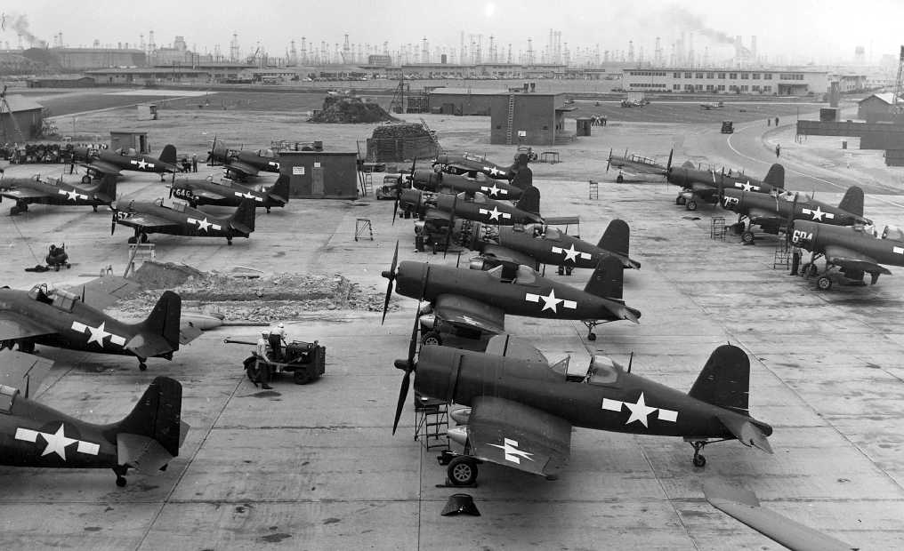 showing a number of ‘factory fresh” FM-2 Wildcats, F4U Corsairs and one tri-colored Curtiss SNC.