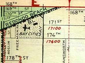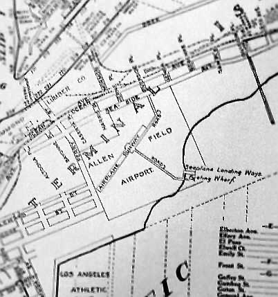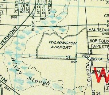 A 1940s street map depicted Wilmington Airport as an irregularly-shaped property outline in between Bixby Slough & Figueroa.