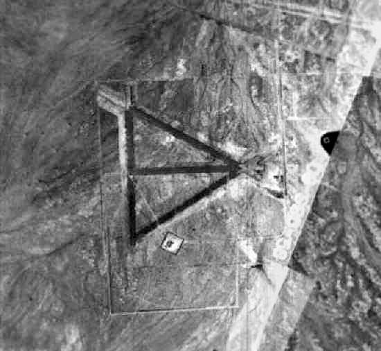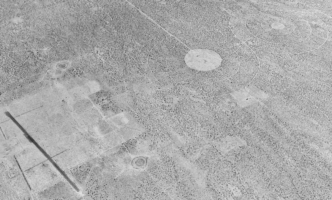 A 1994 USGS aerial view looking northwest at the Cuddeback Dry Lake Airfield, and the 4 target circles located to the north.