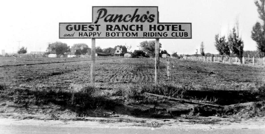 An undated photo of the sign for “Pancho's Guest Ranch Hotel & Happy Bottom Riding Club”.