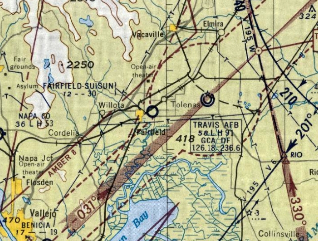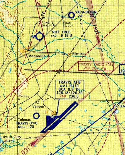 The April 1959 San Francisco Local Aeronautical Chart (courtesy of Paul Columbus) depicted “Travis” as a private airfield having a 2,000' unpaved runway.