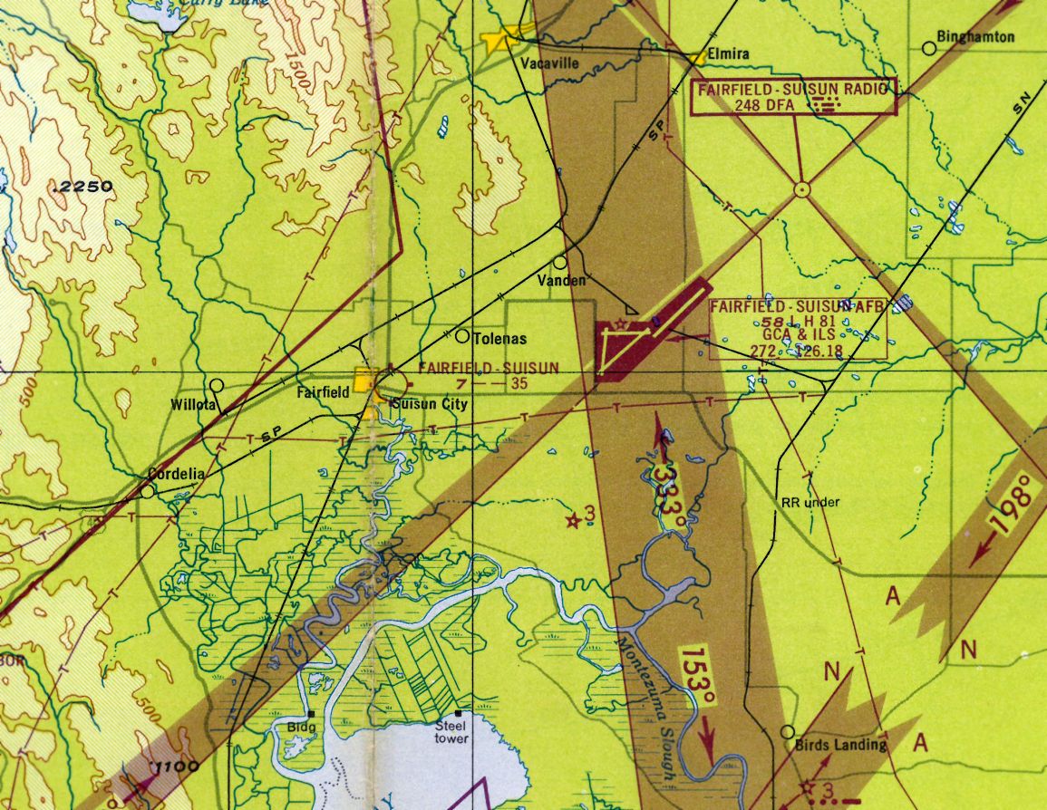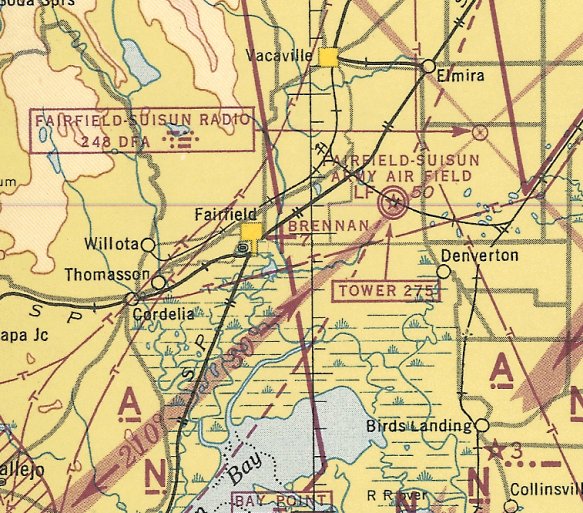 The last aeronautical chart depiction which has been located of Fairfield Suisun Air Park was on the October 1956 Sacramento Sectional Chart,