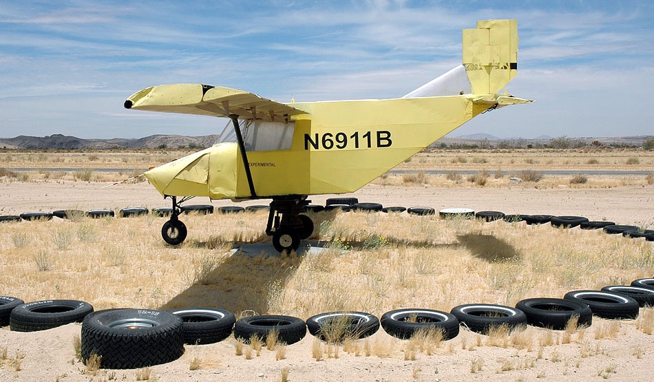 A 2007 photo by Chris Brame of beautiful Bede BD-5 on static display at Williams Airport, seemingly mounted on a joshua tree, but actually mounted on a pole behind the tree.