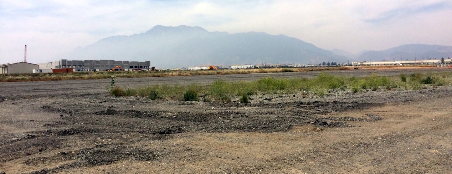 A May 2015 photo looking southwest along the remains of Williams Airport Runway 24, showing the airport buildings remained intact, but the only aircraft on the field was the wind direction indicator Minihawk.
