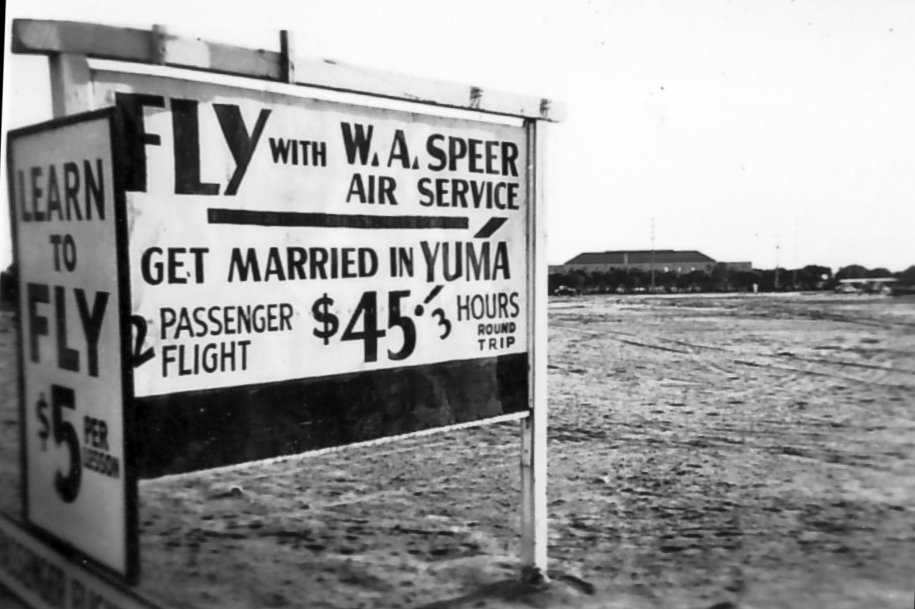 A circa 1940 photo by Frederick Crowther (courtesy of Rick Edgil) of a sign for W.A. Speer Air Service, touting a 3-hour round-trip flight to get married across the state line in Yuma AZ.
