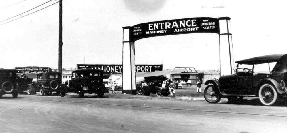 A 1927 photo of an entrance sign at “Mahoney Airport, Where Lindbergh Started.”