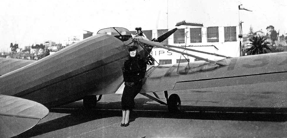 A 1933 photo of Evelyn Speer sitting on a Kinner low-wing monoplane, likely taken at Speer Airport (courtesy of Joanne Lillevold).