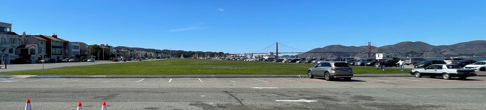 A 10/12/21 photo by Kevin Walsh looking west along the former Marina Airfield runway, with the Golden Gate Bridge in the background.