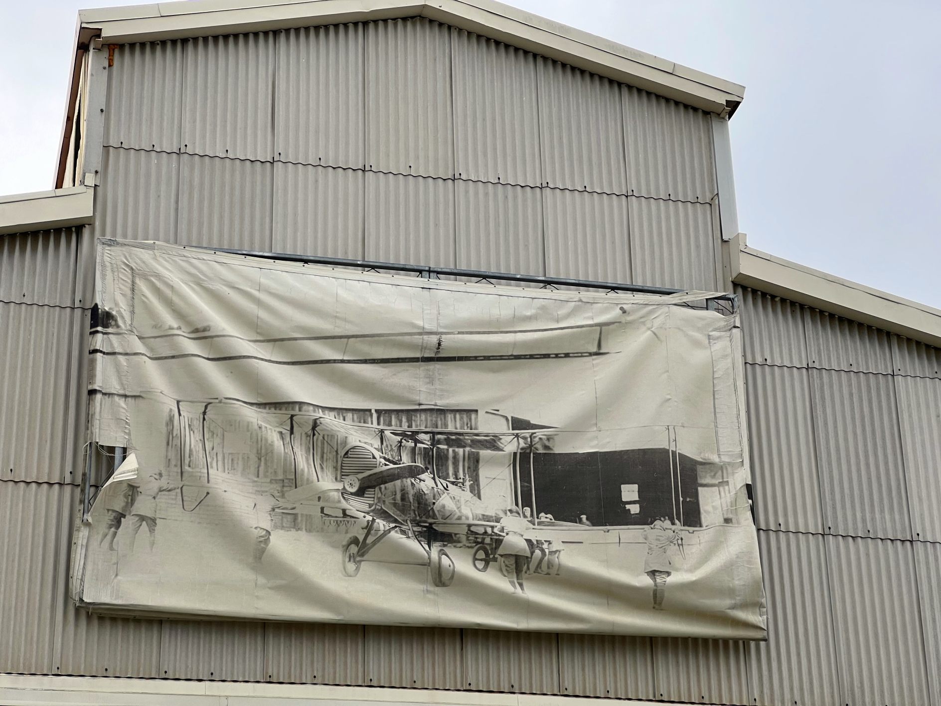 of the hangar labeled “San Mateo Airport”, advertising sales, repairs, storage, and flight instruction.