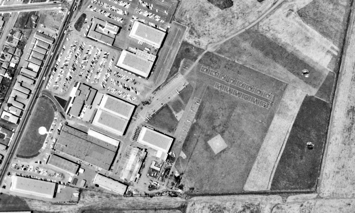 A 1956 aerial photo showed the Ames Airport runway remained distinct, but without any sign of recent aviation use.
