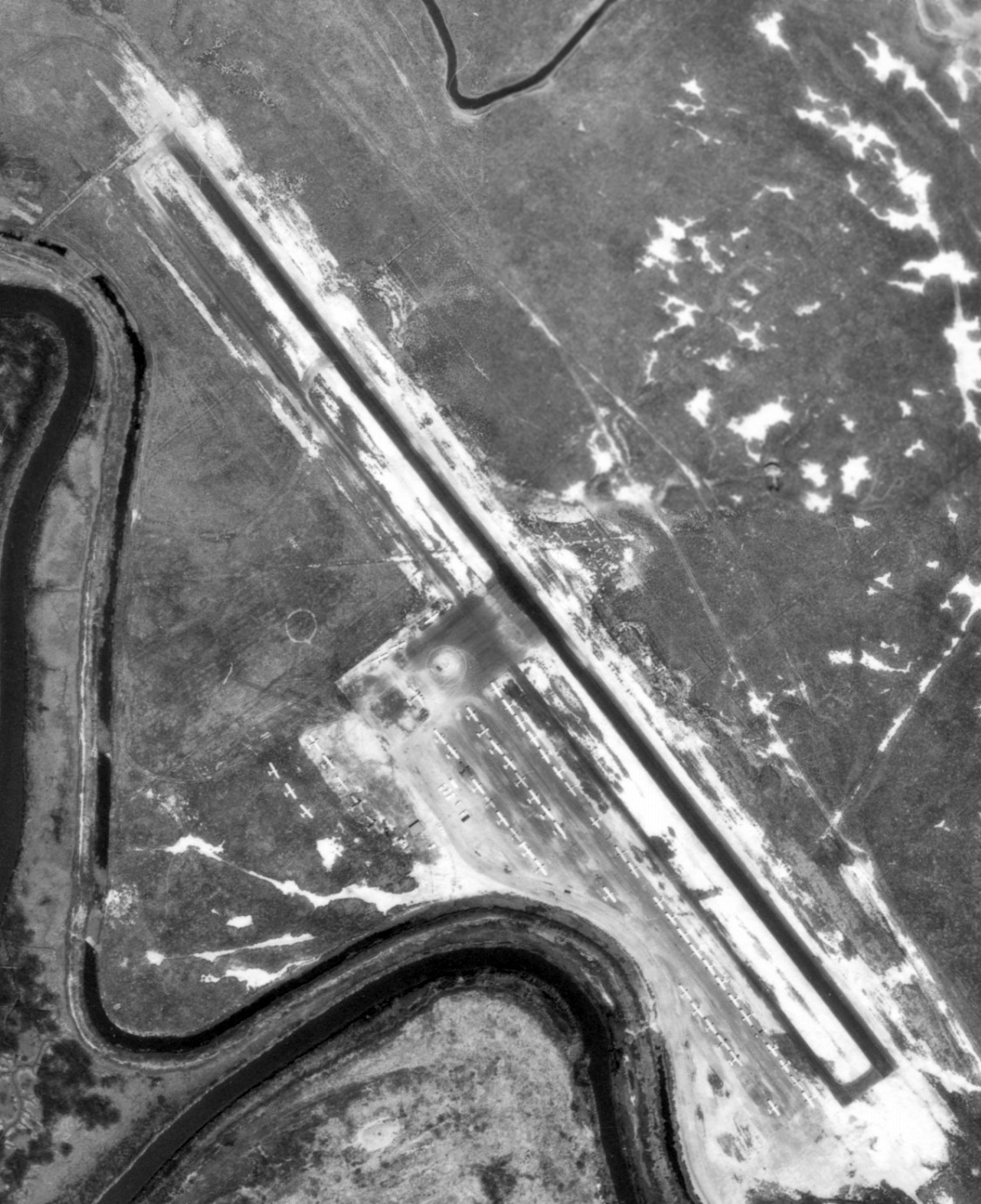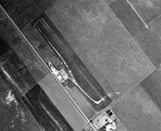 Some small buildings (possibly hangars?) were located to the east of the runway, but no aircraft were visible on the field.