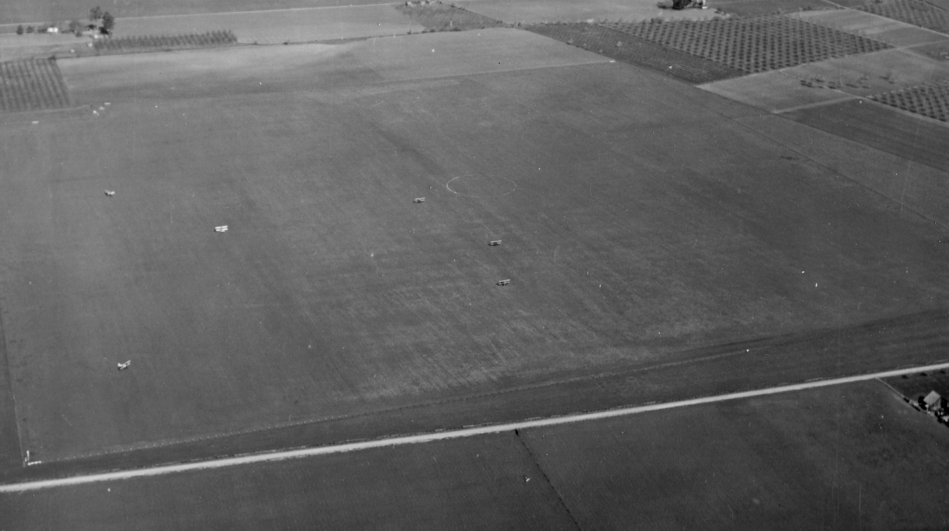 A 1982 aerial view by Dick Jones looking east at Hummingbird Haven, with a glider on the ground at the bottom-left.