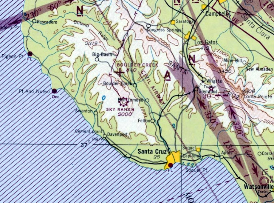 Hilton Airport / Boulder Creek Airport was not yet depicted on the August 1942 San Francisco Sectional Chart.