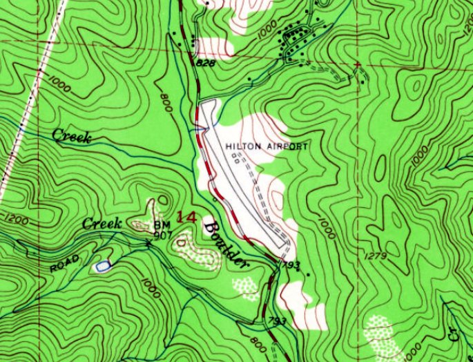 The 1955 USGS topo map depicted Hilton Airport in a very unusual configuration, with a single northwest/southeast runway with a pronounced curve.