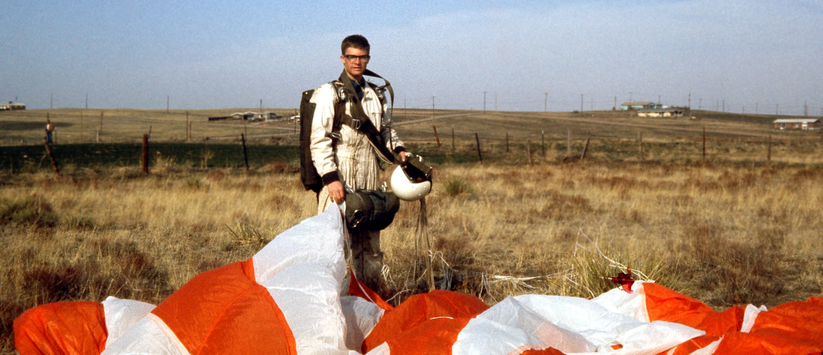 A 1967 photo of Ted Frison after a parachute landing at Columbine Airport.