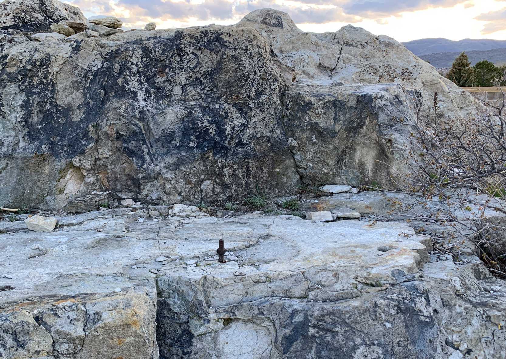 An April 2020 photo by Patrick Wolbach of the bolt & holes which remain in the rock from the former Columbine Airport beacon light tower.