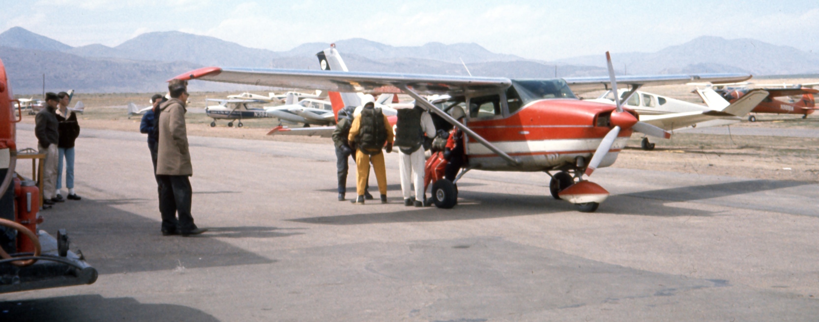 A 1967 photo by Ted Frison of skydivers boarding a Cessna 206 at Columbine Airport.