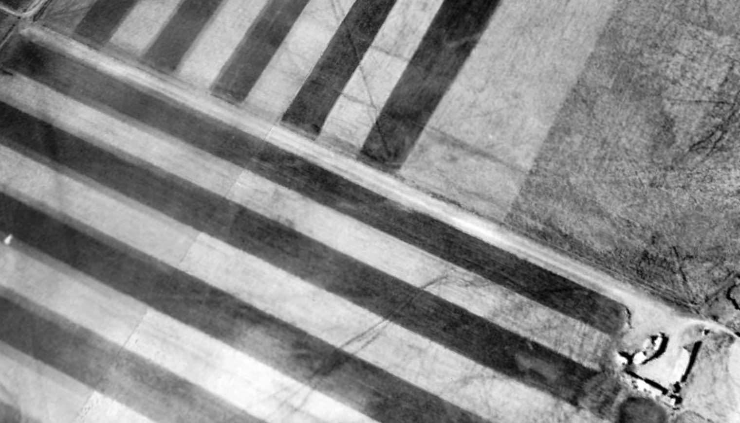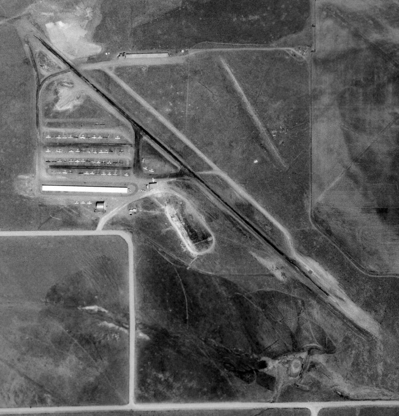 along with an office building northwest of the runway, a single long hangar to the northeast, and at least 23 planes visible parked outside.