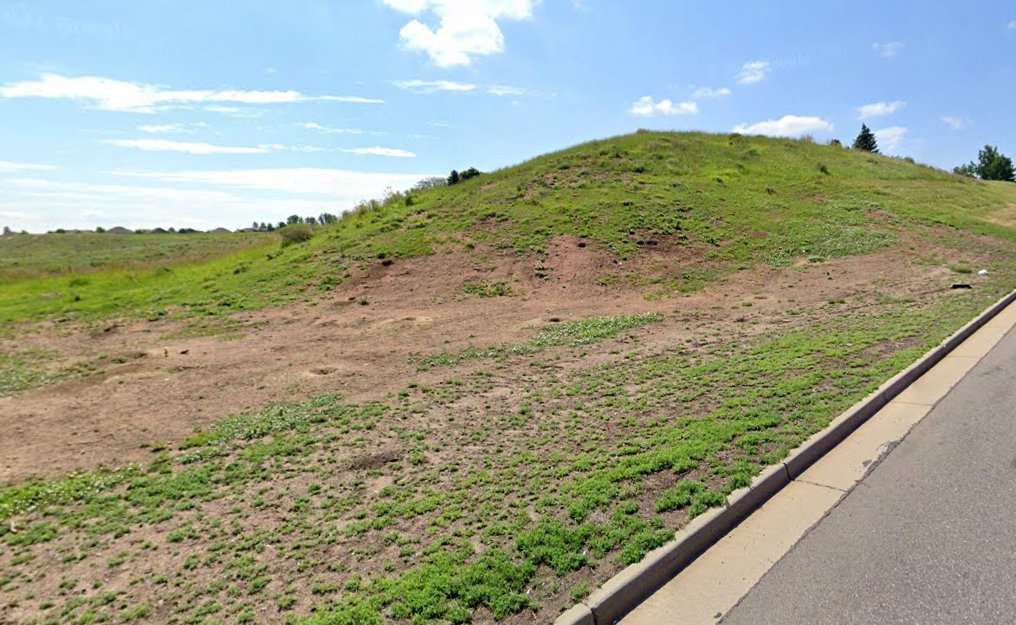 A July 2021 photo (courtesy of John French) looking southeast at a mound on the east side of South Kiplinkg Parkway which was constructed when Columbine Airport's Runway 30 was extended to the northwest.