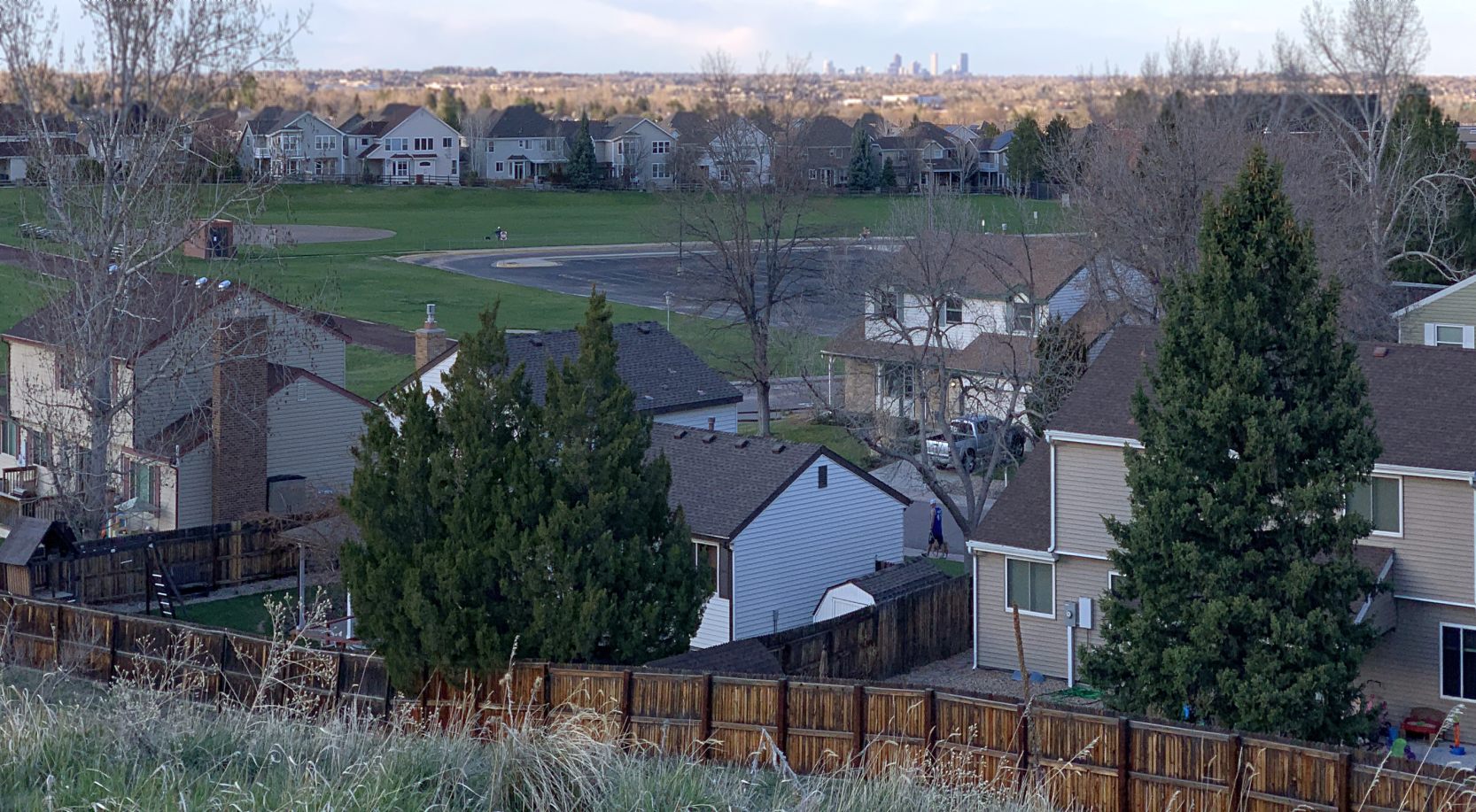 An April 2020 photo by Patrick Wolbach looking northeast at the site of Columbine Airport, with the Denver skyline visible in the distance.