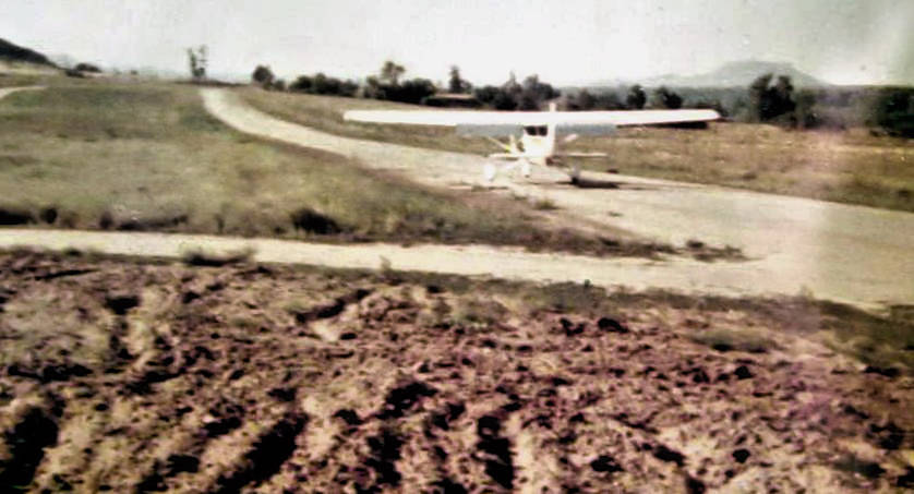 A 1975 photo by Chuck Starck (enhanced by Bill Grasha) looking north at Cessna 172 taxiing at "Clark/Littleton" Airport. Note the infamous 'V' tree in line with the runway.
