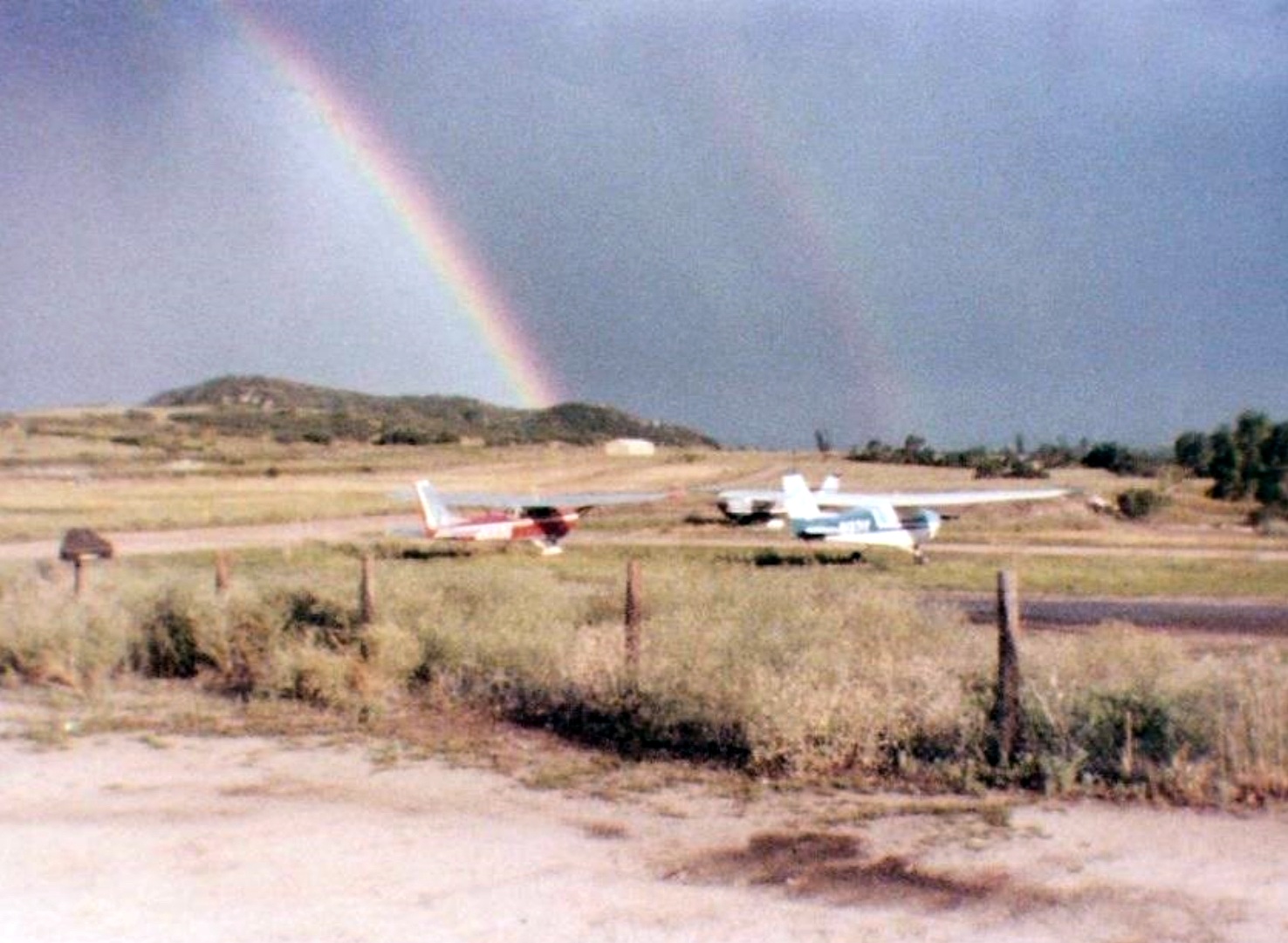 A circa 1970s photo a rainbow over 3 Cessnas at Littleton Airport.
