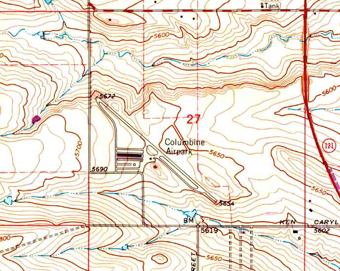 The 1971 USGS topo map depicted Columbine Airpark as having a single paved northwest/southeast runway,