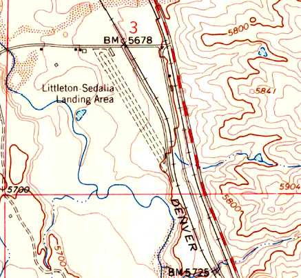 It depicted the “Littleton-Sedalia Landing Area” as having an unpaved northwest/southeast runway with a parallel taxiway & a few small buildings on the north side.