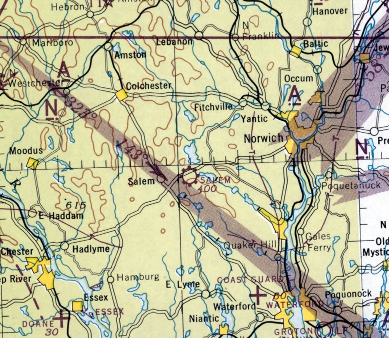 The last aeronautical chart depiction which has been located of Salem Airport was on the 1958 NY Sectional Chart,