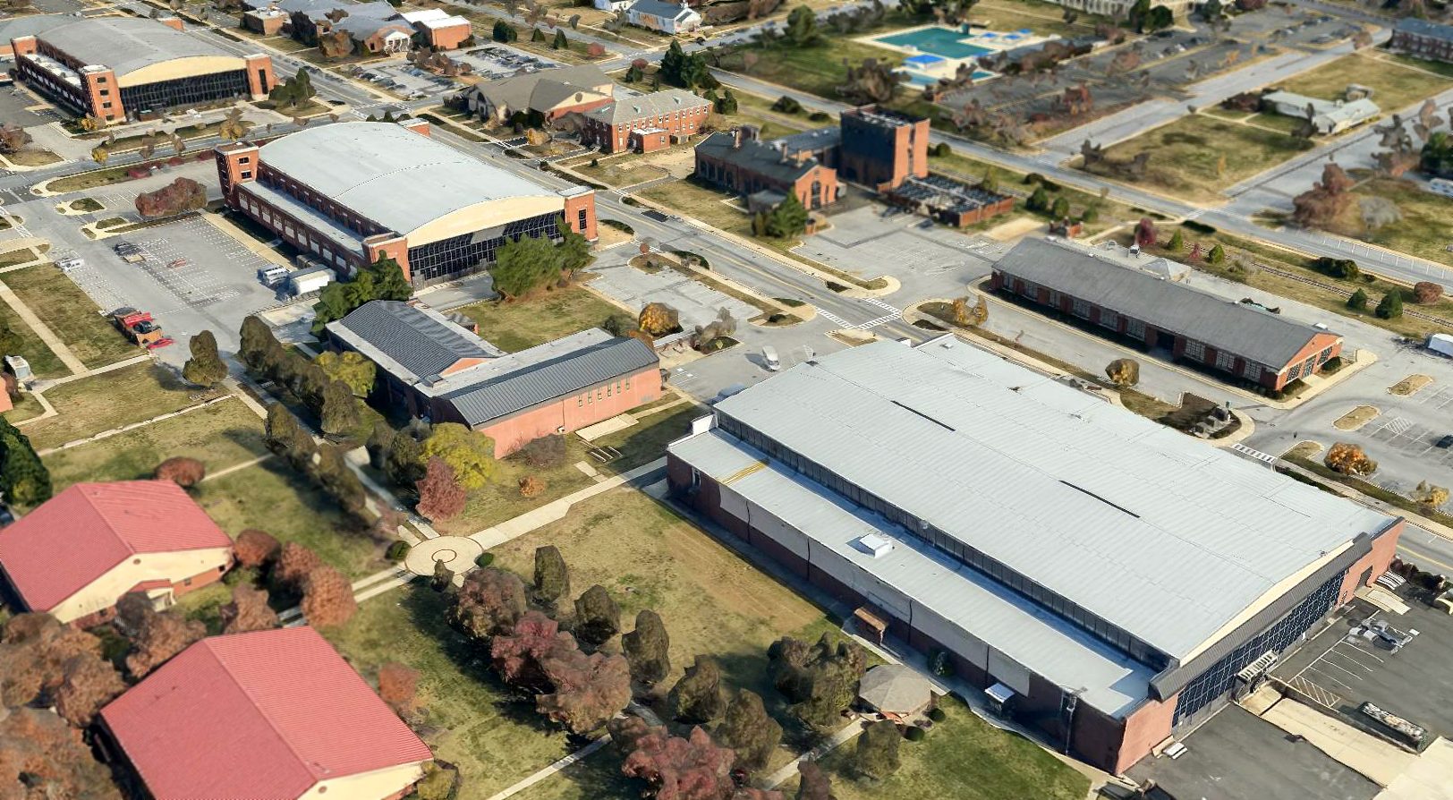 A circa 2010-2017 3-D aerial view looking northeast at 3 former hangars which remain at Bolling AFB.