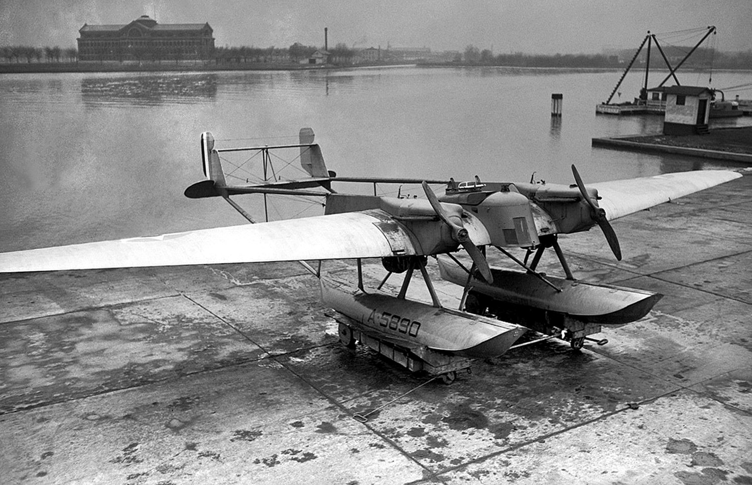 A 1/18/22 photo of the sole Navy Curtiss CT-1, A-5890, a twin-boom bomber floatplane, at Naval Air Station Anacostia, with Roosevelt Hall visible across the river.