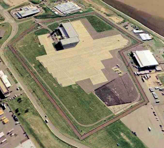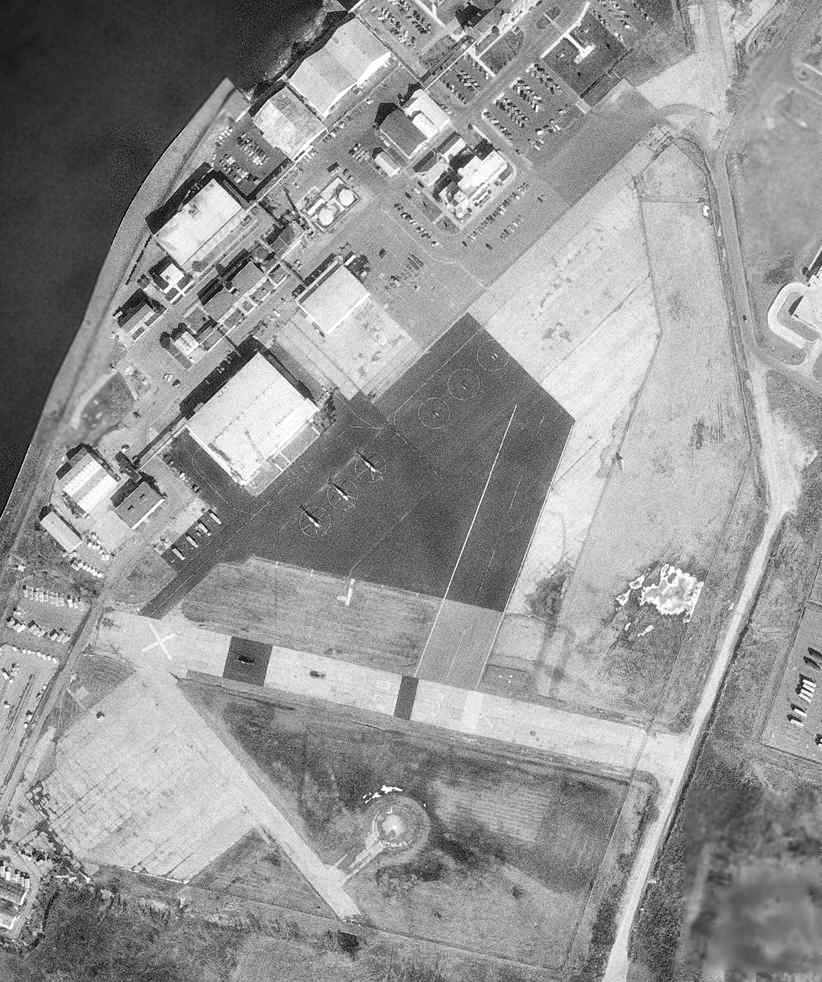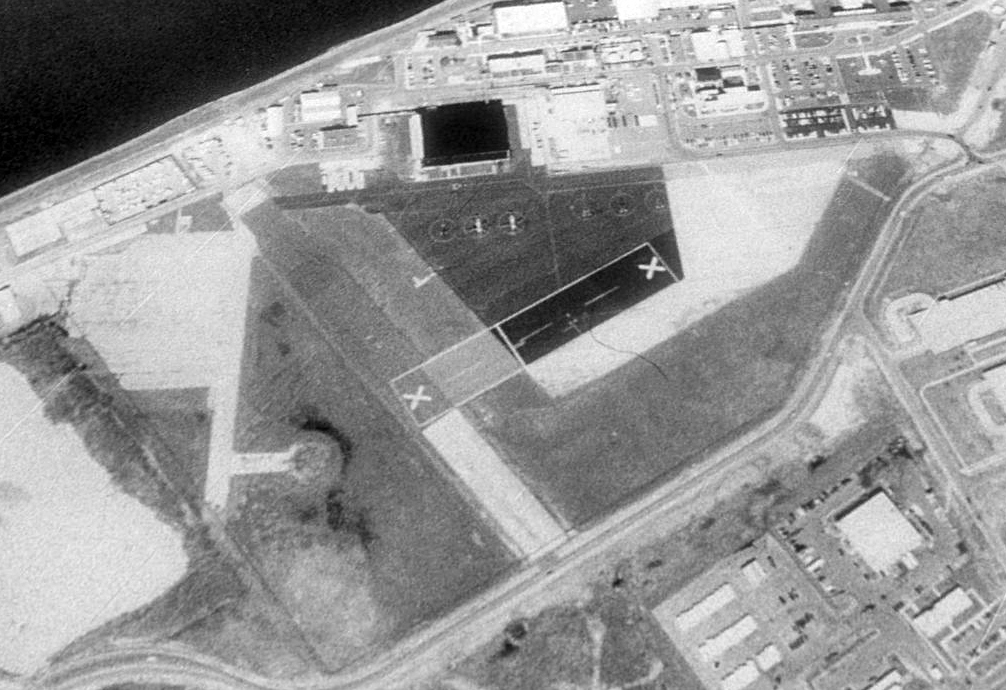 a circa 2005 aerial view looking north shows 2 former hangars which remain in fine condition on the southeast side of the former airfield.