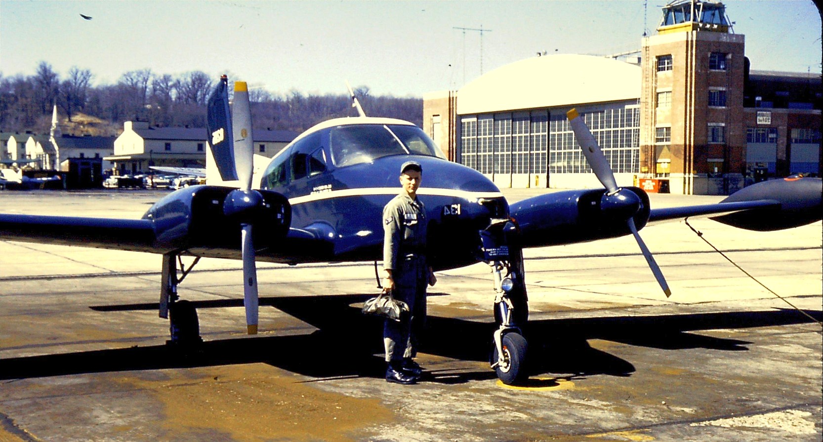 A 1958-59 photo of Paul LaPenta & a Cessna L-27 in front of the Bolling AFB control tower.