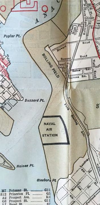 A 1929 street map (courtesy of Kevin Walsh) depicted Anacostia “Naval Air Station” along with “Bolling Field” to the north.