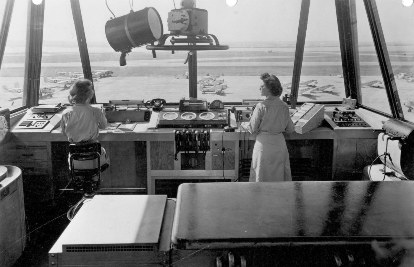 A circa 1946-49 photo (courtesy of Bruce Reid) of the interior of Bolling Field's control tower, with B-25 Mitchells, P-47 Thunderbolts, and other aircraft on a crowded ramp.