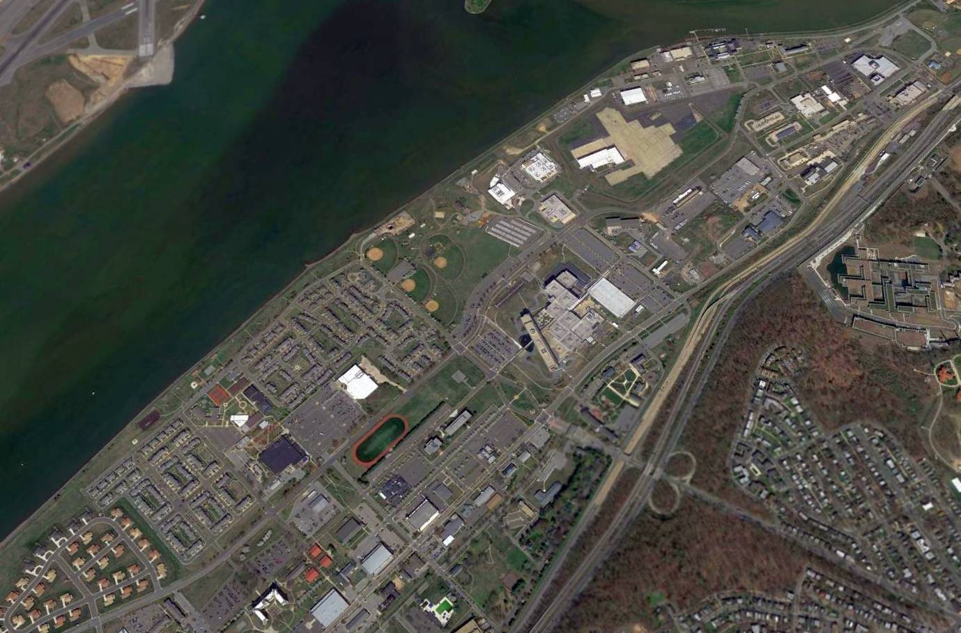 A 2015 aerial view looking northwest at Bolling AFB (at bottom), also showing the site of NAS Anacostia at the top.