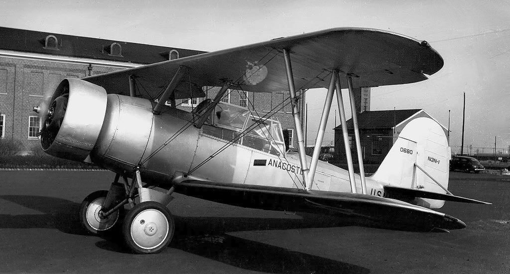 An undated photo of a Naval Air Facility N3N-1 biplane maked “Anacostia” & assigned to flight test duties at the base, featuring an unusual (perhaps unique) enclosed cockpit canopy.