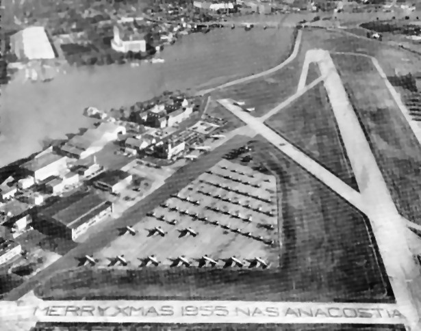 A 1955 aerial view looking north at NAS Anacostia, with “Merry Xmas 1955 NAS Anacostia” spelled out on the east/west runway (courtesy of Richard Weckman).