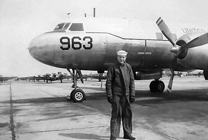A mid- to late-1950s photo by Lester Lemar of C.W. Wolf in front of a Convair R4Y & several other aircraft on the ramp at Anacostia.