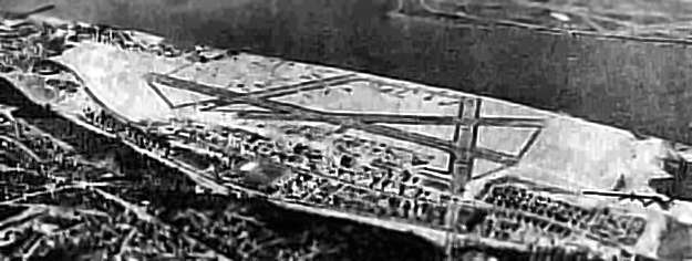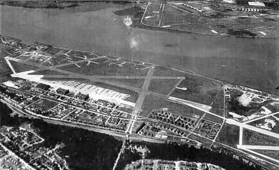 A 4/23/32 aerial view looking northeast at Bolling Field, with NAS Anacostia in the background.