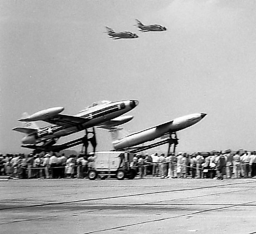 overflying a rare EF-84G Thunderjet & a MGM-1 Matador at a Bolling AFB airshow.
