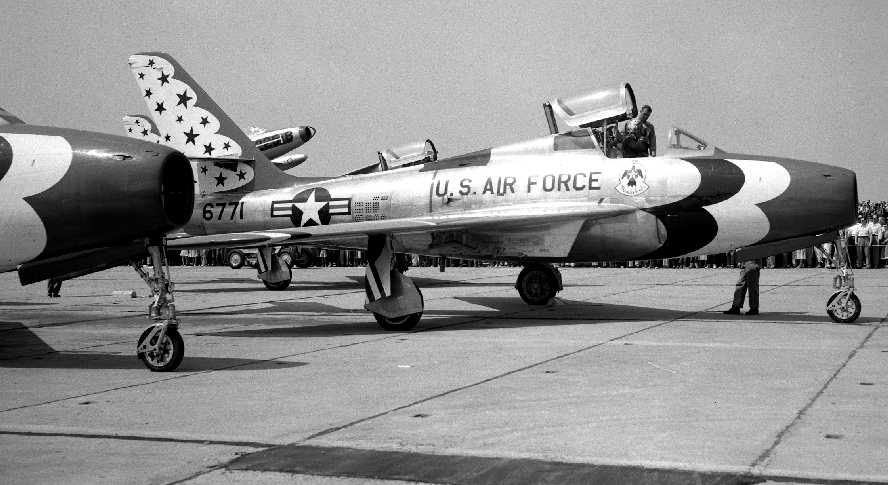 A circa 1954-56 photo by Howard Marler (courtesy of Helen Marler) of a Thunderbirds F-84F Thunderstreak at a Bolling AFB airshow.
