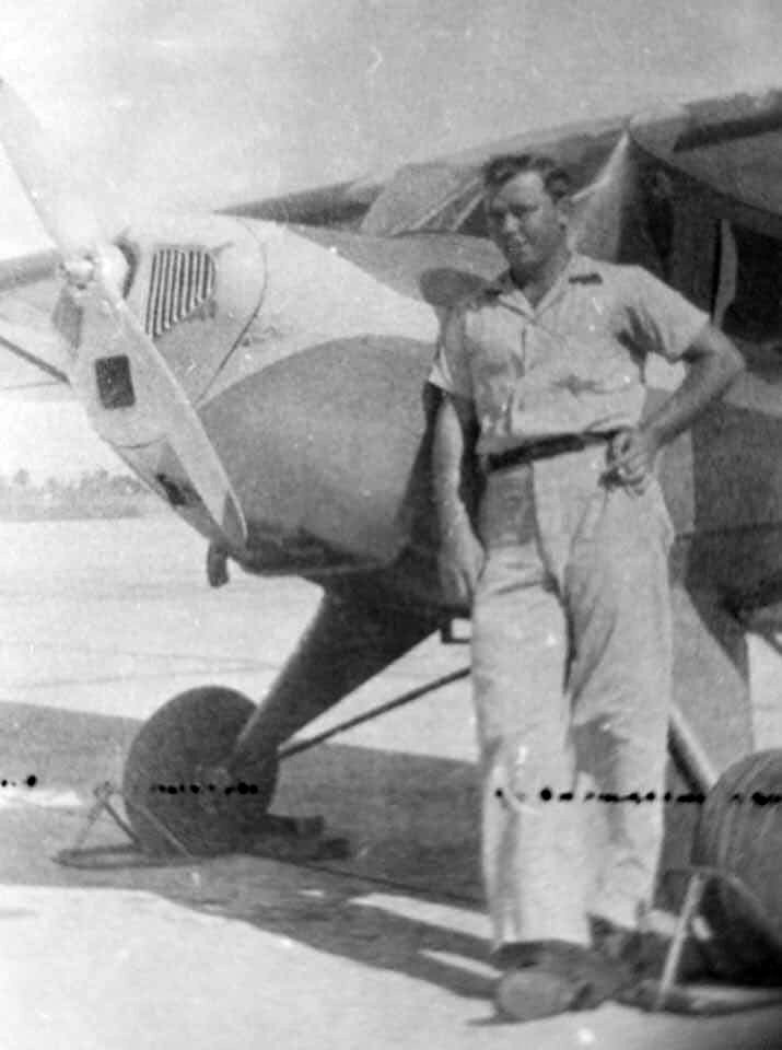 Someone has a photo of one of their relatives in his pilot's gear standing next to his plane at the field in Bostwick.”
